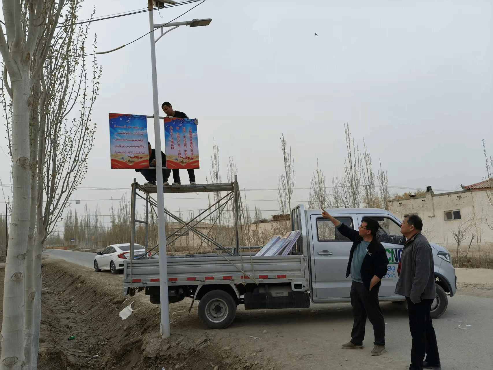 亚喀艾日克乡阔什吐格曼(6)村工作队采购百日草籽,开展“美化村委会”志愿活动。制作12组宣传栏和村主干道旗,更新乡村大舞台背景墙。走访慰问困难群众家庭、患重病村民和孤寡老人,购置米面油、自行车和防盗门等生活物资设施。