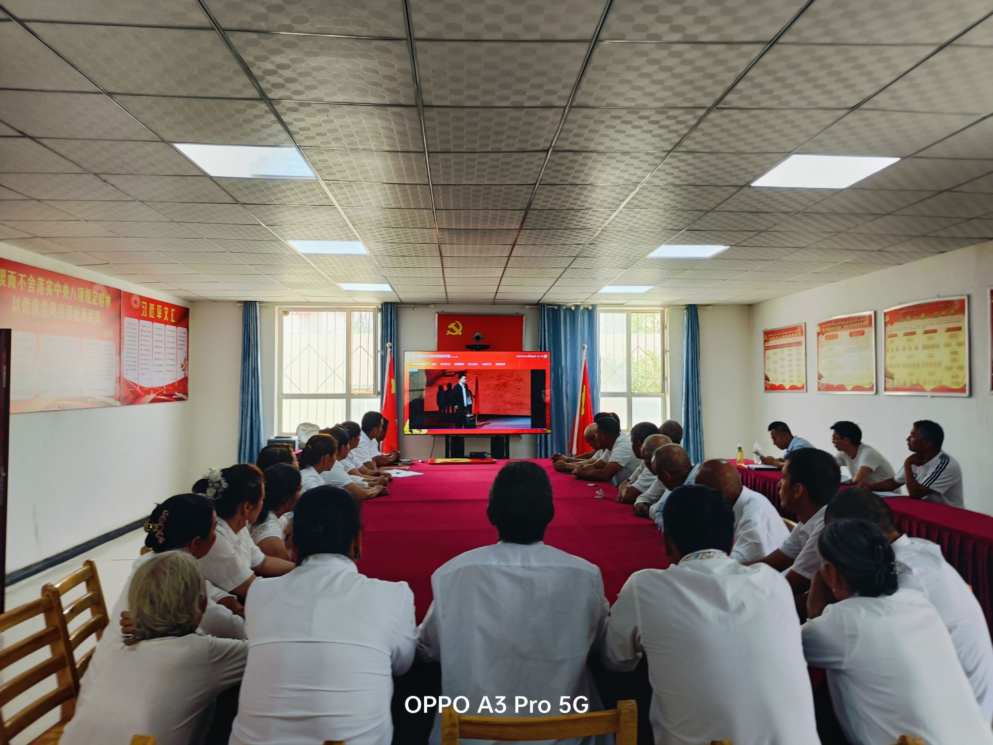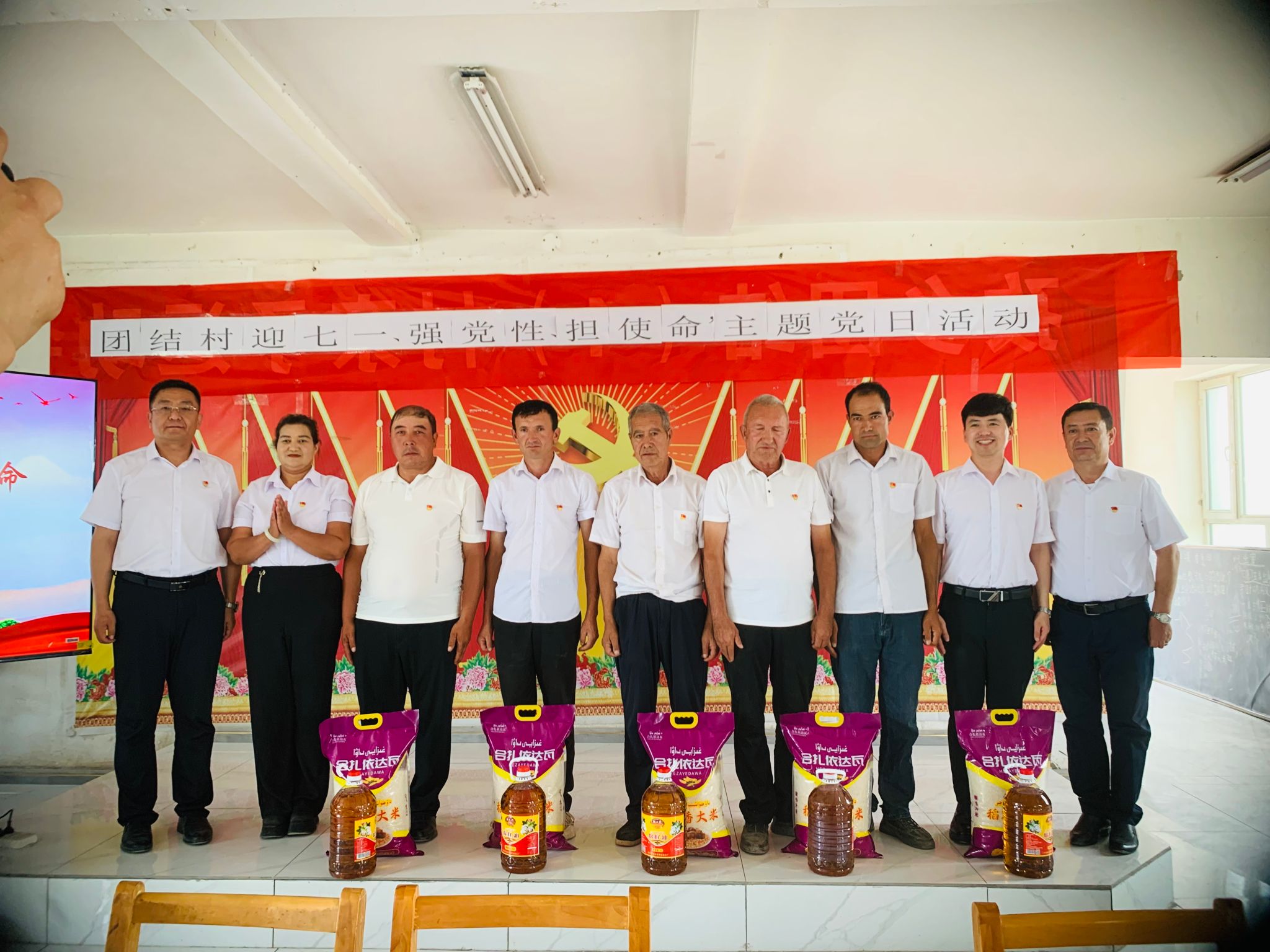 亚喀艾日克乡亚喀艾日克(8)村组织党员观看“学习身边榜样”优秀案例展播,重温入党誓词,现场交纳党费,工作队和村“两委”一起走访慰问了老党员和困难党员。