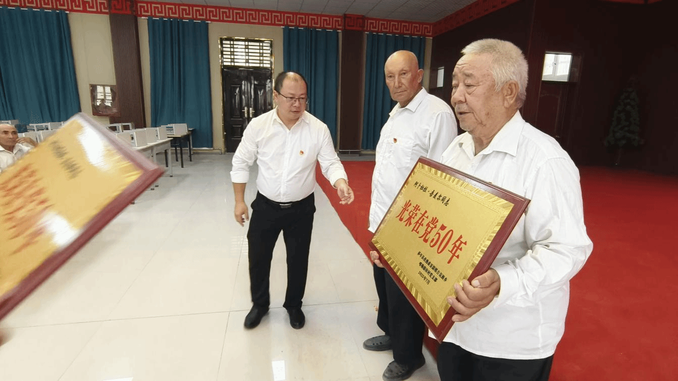 给老党员颁发“光荣在党50年”纪念牌匾