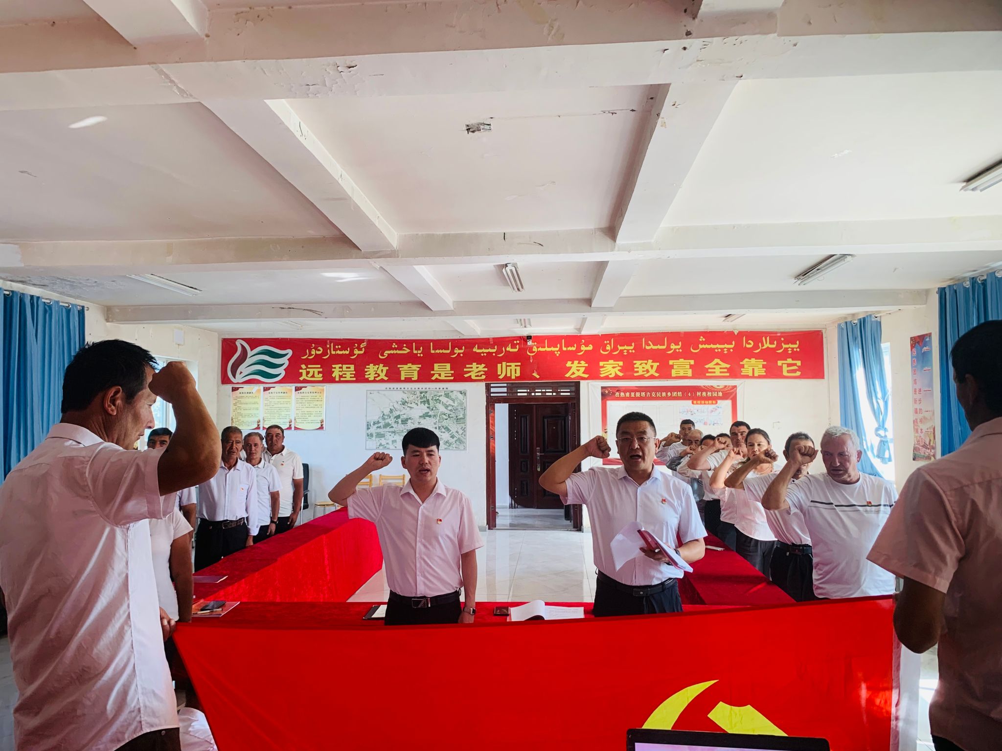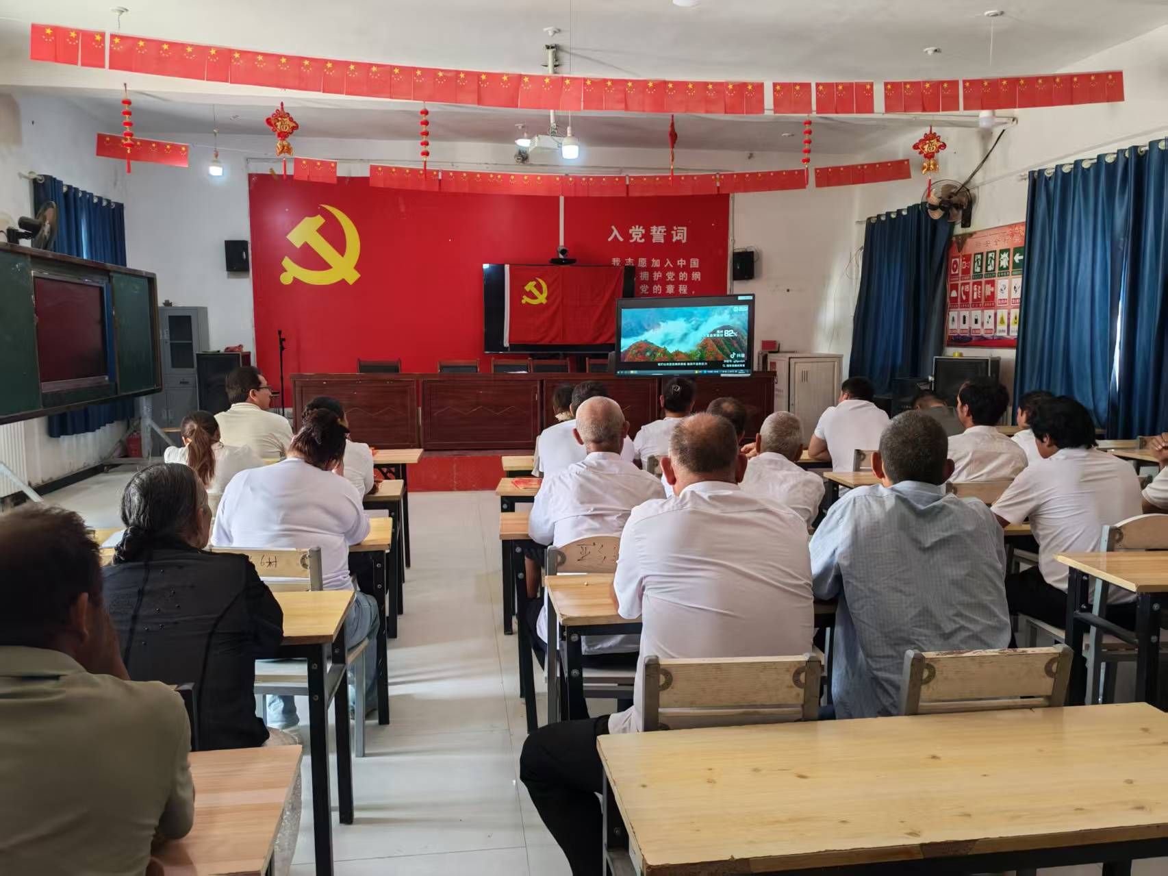 亚喀艾日克乡阔什吐格曼(6)村工作队党支部联合村党支部组织党员观看全国生态日宣传教育视频,开展重温入党誓词活动,并组织党员分享交流体会。