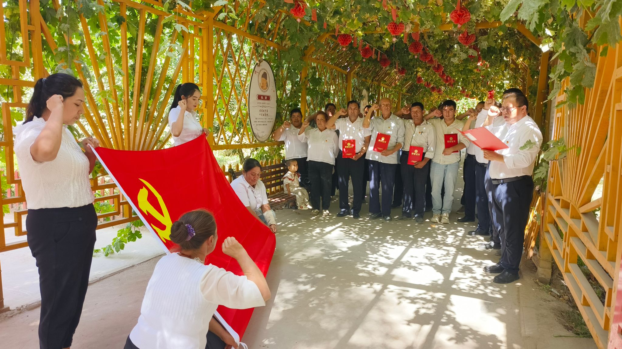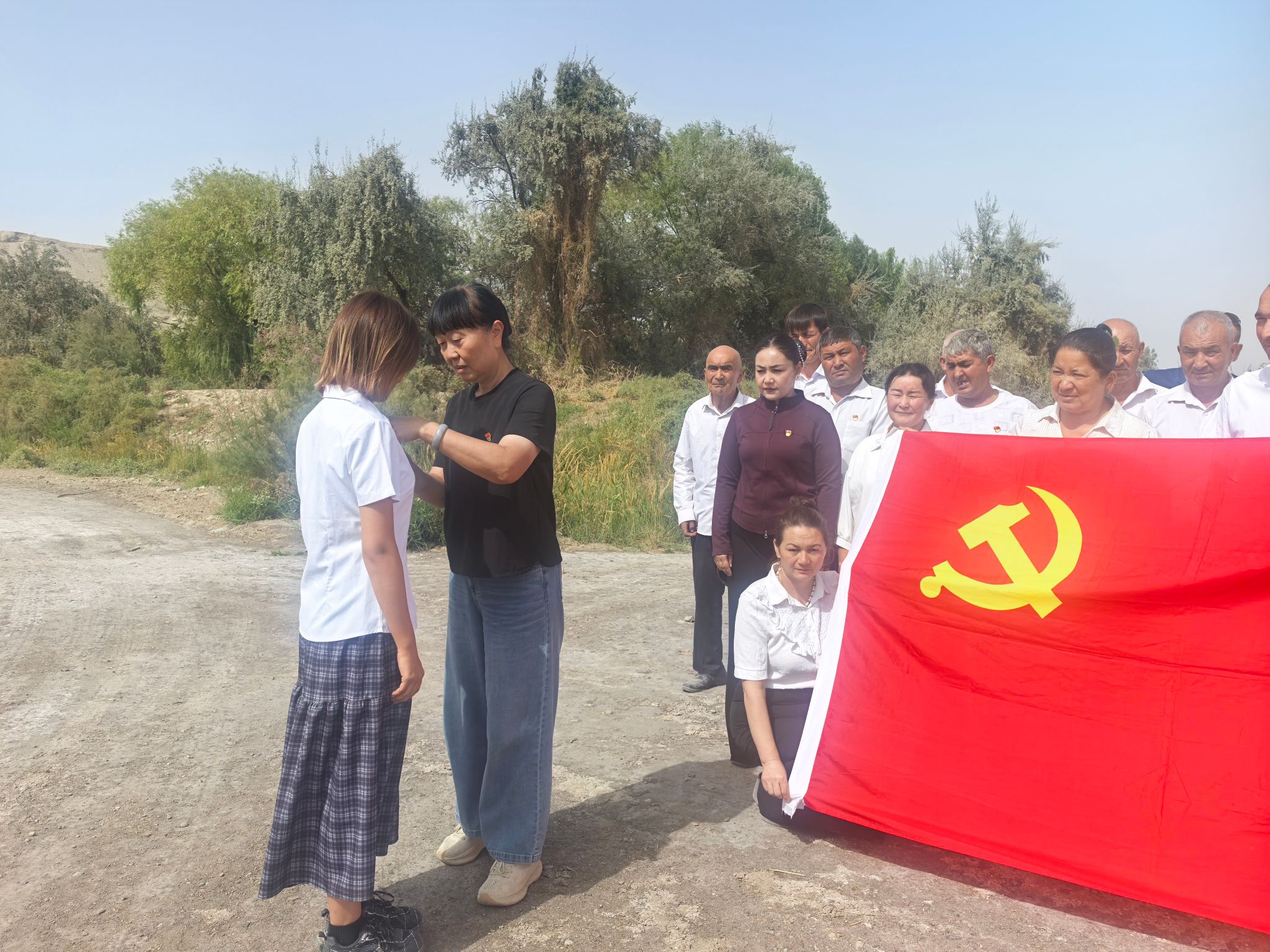 亚喀艾日克乡亚喀艾日克(8)村工作队党支部联合村党支部组织党员前往1村湿地和喀群一级水电站进行实地参观,并重温入党誓词,365英国驻莎车县前方党工委书记、(8)村工作队长李莉同志为新发展的党员佩戴党员徽章。